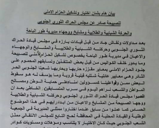 وأكد المجلس والحركة والمشايخ والأعيان في بيان صادر عنها أن «مداولات بخصوص تشكيل الحزام الأمني للصبيحة توصلت إلى الرفض القاطع لما يدور خلف الكواليس من قبل بعض المتنفذين وتسابقهم المحموم على جنود الحزام الأمني بمعايير مقززة حاربها ويحاربها شعبنا الجنوبي الحر الثائر».