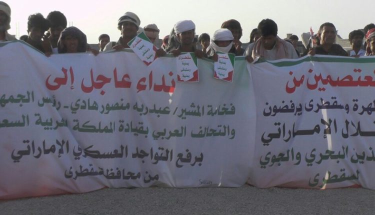 وأكد السقطري أن هذه الاعتصام يأتي احتجاجا على إرسال قوات إماراتية عبر مطار وميناء أرخبيل سقطرى مناشداً الرئيس عبدرية منصور هادي ودول التحالف الى النظر في قضية أرخبيل سقطرى بعين الاعتبار