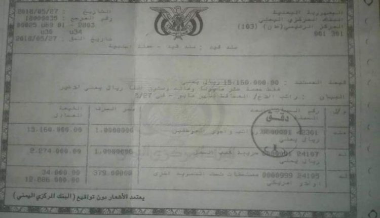 وأوضحت الوثيقة الرسمية المبلغ الذي يتقاضاه محمد منصور زمام – محافظ البنك المركزي اليمني المعين من قبل الرئيس هادي قبل أشهر، حيث والمبلغ الذي يتقاضاه زمام شهرياً وصل إلى أكثر من 15 مليون ريال يمني أي ما يعادل (30) ألف دولار أمريكي.