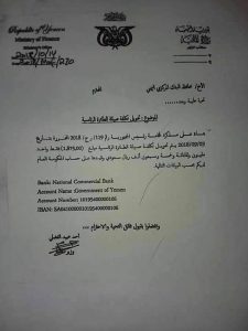 كما أظهرت وثيقة أخرى من وزير المالية الى محافظ البنك المركزي اليمني بتأريخ 24/10/2018م. طلب تحويل نفقات سفر لرئيس الجمهورية حددتها الوثيقة بمبلغ ( 3 مليون و 757 ألف ريال سعودي) بناء على مذكرة من مكتب الرئاسة رقم ( 121/ر ج /2018م ) بتاريخ 22/10/2018م ، على أن يقيد المبلغ على حساب الحكومة العام.
