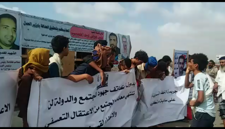 وقال المشاركون ان الامارات تقوم بالصاق التهم الكيدية من اجل تكميم أفواه الأحرار والتخلص منهم من خلال الإخفاء القسري، في ضل الصمت المتعمد من قبل سلطات هادي ومن اسموهم بالخونة والعملاء، في إشارة إلى المجلس الانتقالي التابع للإمارات.