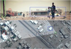 ويمكن تأكيد هذا الموقع عن طريق مطابقة الميزات الموجودة في صورة Iona Craig مع صورة القمر الصناعي التي التقطت في 08 يونيو 2016 ، وهي متاحة على Google Earth. وتظهر مئذنة باللون الأحمر في الخلفية ، في حين يظهر عمود التلغراف باللون الأخضر في المقدمة.
