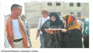 وأضاف: في 6.7.2015 ، في منطقة الافيوش ، وتحديداً في سوق الثروة الحيوانية ، انتقل الحوثيون الذين كانوا يحرسون نقطة تفتيش أمنية على بعد 200 متر من السوق إلى سوق الفيوش وأطلقوا صاروخ كاتيوشا على السوق “.