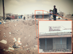 وتشير إلى استخدام تلك المنطقة المحددة كسوق للمواشي للأغنام والماعز. كما هو مذكور أعلاه ، تظهر صورة الموقع الذي التقطته Iona Craig لـ Knight Labs Story Map بوضوح علامة المطعم واسمه.
