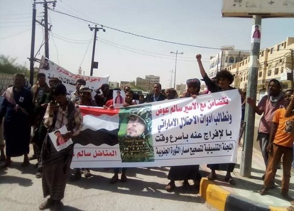 ورفع المحتجون لافتات طالبوا فيها الاحتلال الإماراتي وأدواته بالإفراج الفوري عن القيادي سالم عوض الربيزي.