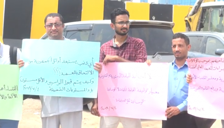 وأوضح بيان صادر عن وقفة احتجاجية للطلاب المتقدمين في اختبارات المعهد العالي للقضاء أمام المجمع القضائي في مدينة عدن، احتجاجا ي على إسقاط أسمائهم من كشوفات المقبولين ضمن الدفعة الجديدة في المعهد العالي للقضاء، واستبدالهم بآخرين حسب الوساطة.