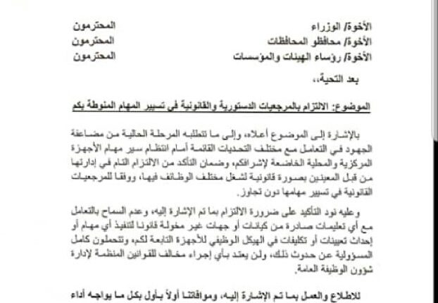 وحملت حكومة هادي كافة المسئولين في المحافظات الجنوبية كامل المسئولية في حال حدوث أي تجاوزات من الانتقالي ، مؤكداً أنه لن يُعترف بأي إجراء مخالف للقوانين المنظمة لإدارة شؤون الوظيفة العامة.