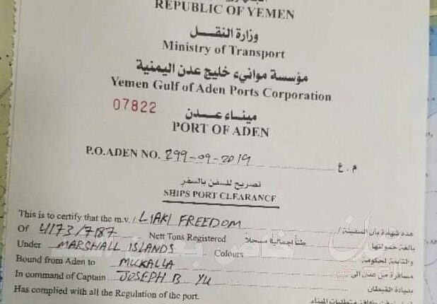 كشفت وثيقة رسمية إن كميات هائلة من الوقود الذي تم الادعاء بانه تم منحه لصالح كهرباء عدن من قبل دولة الإمارات قد تم تصديره إلى مدينة المكلا يوم الثلاثاء في عملية غير مفهومة ، وبحسب الوثيقة التي هي عبارة عن تصريح خروج للسفينة MV Liaki Freedom والتي تتبع جنسيتها جزر المارشال ويملكها رجل اعمال يوناني الجنسية وتفاصيلها على النحو التالي : For Petrochem General Management S.A