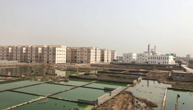 تحيط مياه الصرف الصحي القاتلة بعشرات المباني السكانية التابعة لمشروع “مجور السكني” في مديرية الشيخ عثمان بمدينة عدن.