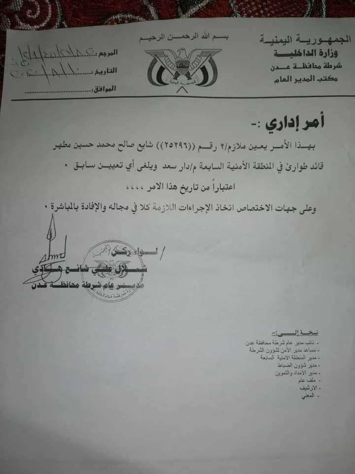 بالتزامن مع وصول لجنة عسكريه سعودية اليوم إلى مدينة عدن لتنفيذ الآلية التنفيذية لاتفاق الرياض الذي ينص على اخلاء مدينة عدن من القوات الموالية للانتقالي وتسليم الملف العسكري للجانب العسكري في المدينة ، أصدر مدير الأمن السابق شلال على شائع اليوم قراراً جديد قضى بتعيين قائد طوارئ في دار سعد والغى القرار السابق ، وصدور قرار كهذا بعد أسبوع من تعيين العميد محمد الحامدي مديراً لأمن عدن ، يعد رسالة واضحة بان الانتقالي يرفض تسليم الملف الأمني والعسكري في المدينة لأي طرف اخر ، وجاء قرار شلال بعد أيام من لقاء جمع قيادات في المجلس الانتقالي بمدير الأمن المعين الحامدي في المكلا في محاولة من الانتقالي لإملاء علية شروط للتعامل معه في إدارة أمن عدن.