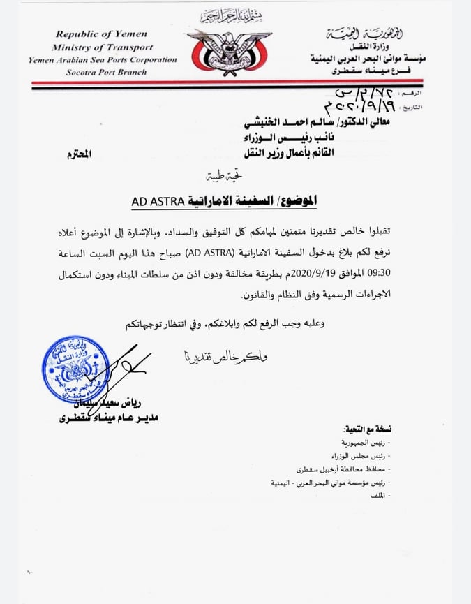 وقال سليمان في رسالة رسمية بعثها إلى القائم بأعمال وزير النقل بحكومة هادي سالم الخنبشي، :”إن سفينة ( AD ASTRA) الإماراتية دخلت إلى الميناء أمس السبت الساعة ” 30 : 9″ صباحاً بشكل مخالف للقانون، ودون أن تحصل على إذن من سلطات الميناء”.