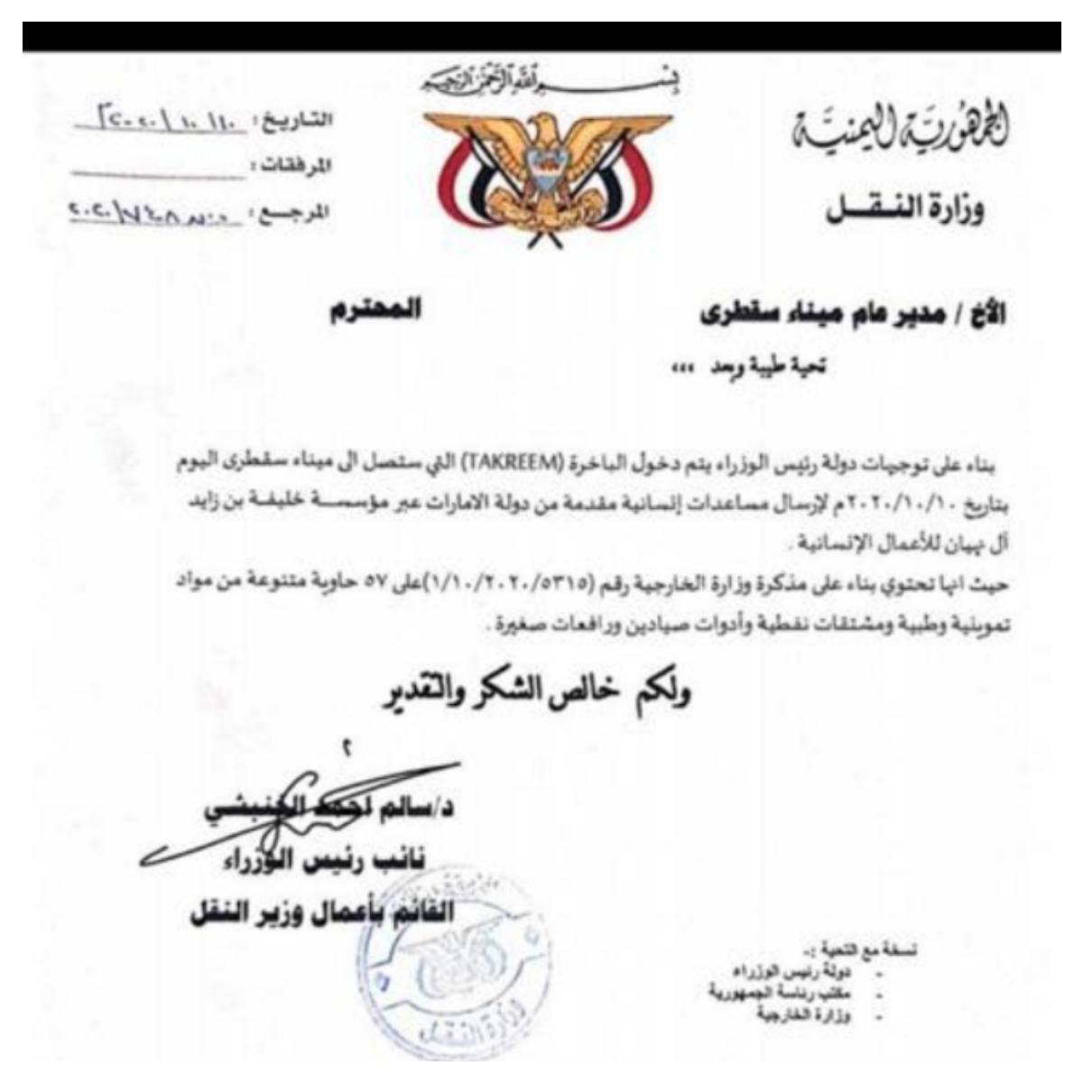 وأوضح الجبواني أن تواطؤ مكشوف من معين عبدالملك الذي لا يزال مكلف بتشكيل الحكومة الجديدة، مرفقا ذلك بوثيقة لنائب رئيس الوزراء القائم باعمال وزير النقل سالم الخنبشي للسماح للسفينة بالدخول إلى الجزيرة.