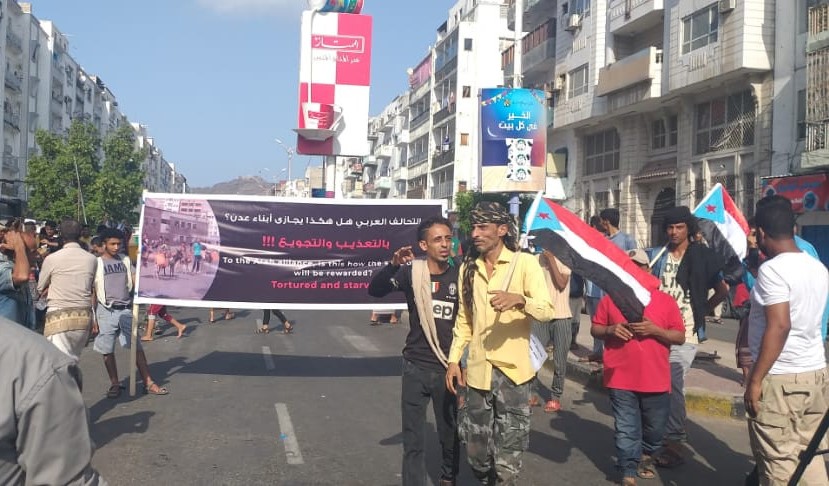 وقال مراسلنا أن المتظاهرين توافدوا من عدة مديريات إلى المعلا وبدأو بالتجمع والتحرك صوب مقر التحالف احتجاجا على انهيار الخدمات أبرزها الكهرباء والمياه والمطالبة بصرف المرتبات.