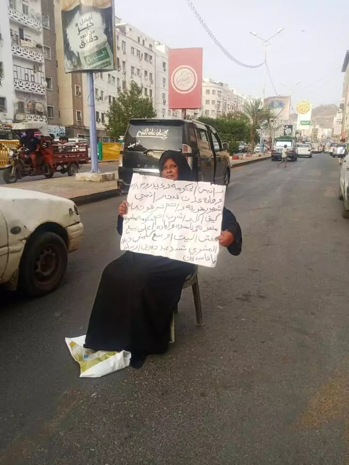 وظهرت الممرضة نعمة وهي تفترش الشارع في عدن معها لافتة تتهم حكومة هادي ورئيس المجلس الانتقالي عيدروس الزبيدي بنهب مرتبها لشهور طويلة.