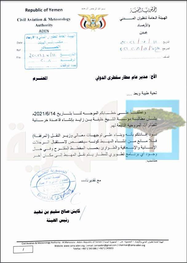 وفي وثيقة أخرى، أبلغ رئيس الهيئة العامة للطيران المدني والأرصاد صالح سليم بن نهيد، مدير مطار سقطرى بالموافقة على إنشاء مدرج وقاعدة خرسانية لاستقبال المروحيات الإماراتية.