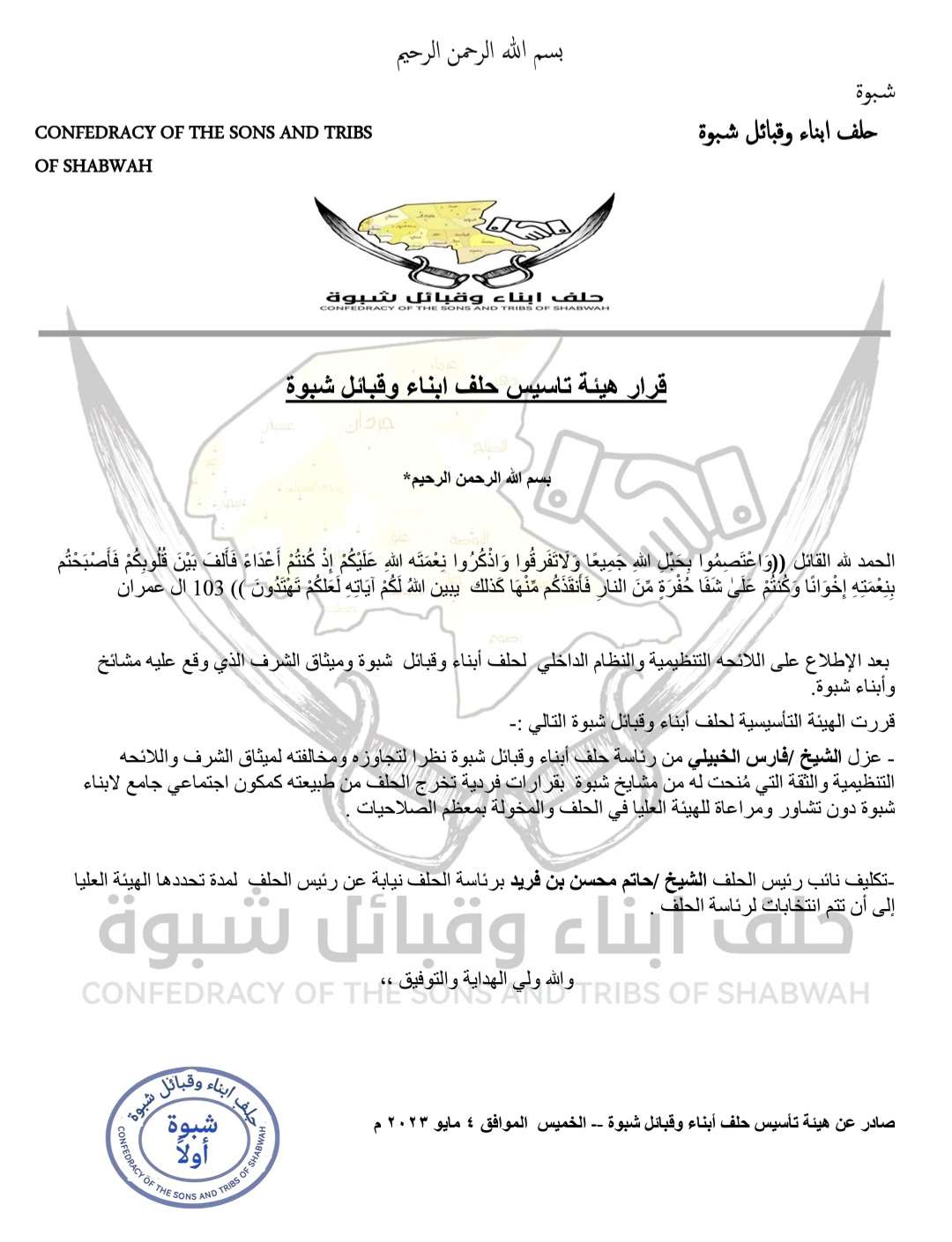 وأكدت “هيئة تأسيس الحلف القبلي”، أن قرار عزل الشيخ فارس الخبيلي من رئاسة الحلف لتجاوزه ميثاق الشرف واللائحة التنظيمية والثقة التي منحته قبائل شبوة، باتخاذه قرارات فردية.