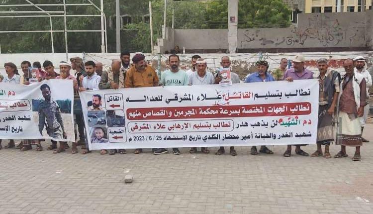 نظم أبناء مديرية خور مكسر بعدن، وقفة احتجاجية حاشدة للمطالبة بسرعة تسليم قتلة الشاب الكلدي، وعلى رأسهم القيادي في فصائل المجلس الإنتقالي علاء المشرقي.