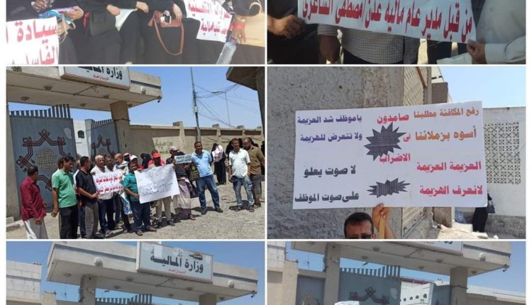نفّذ عدد من موظفي مكتب وزارة المالية بعدن، اليوم الاثنين، وقفة احتجاجية أمام مبنى الوزارة، رفضاً للمظالم والتهميش الذي يعانونه من قبل الوزارة ومدير مكتب المالية في المحافظة.