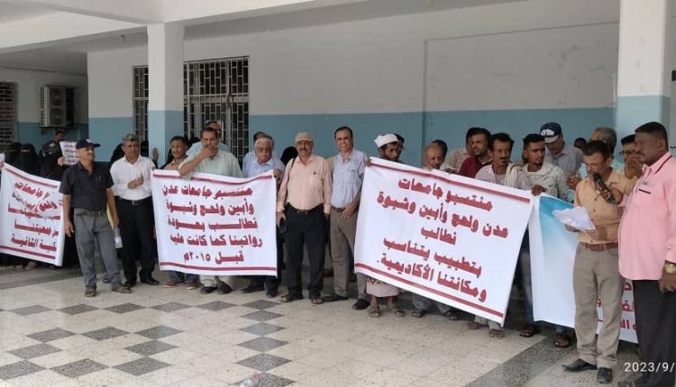 نفذ عشرات الأكاديميين في كلية الطب بجامعة عدن وقفة احتجاجية استجابة لدعوة نقابة هيئة التدريس و ذلك ضمن خطة التصعيد المطالبة برفع الرواتب وإطلاق العلاوات السنوية.