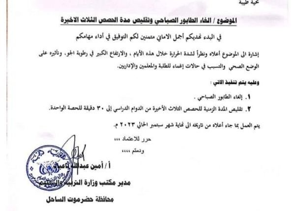 وأقرّ مكتب التربية والتعليم بساحل حضرموت إلغاء الطابور الصباحي وتقليص الحصص الدراسية حتى نهاية سبتمبر الجاري .
