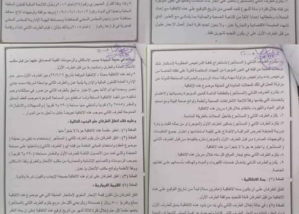 وقال العولقي في شكوى” أنه وقع عقدا مع السلطة المحلية بمديرية التواهي في العام 2008 يقضي باستئجار الأرضية المجاورة لنقابة الصحفيين وتحويلها إلى محلات تجارية بواقع عقد إيجار مدته 20 سنة يبدأ في 2008 وينتهي في 2028 .