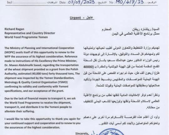 كشفت وثيقة عن صفقة فساد جديدة، لحكومة معين عبدالملك ، في شحنة قمح مقدمة من دولة بولندا للشعب اليمني.
