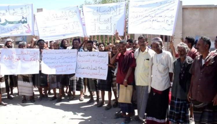 ورفع المحتجون، شعارات تندد بتواطؤ وتماهي السلطة القضائية مع النافذين من سلطة الحكومة الموالية للتحالف ومجلسها الرئاسي، للسطو على أراضي المواطنين.