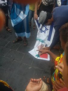 أحرق العشرات من المحتجين في حضرموت, أعلام الاحتلال الاسرائيلي وصور بن زايد تضامنا مع فلسطين.