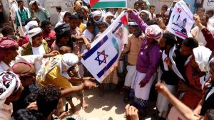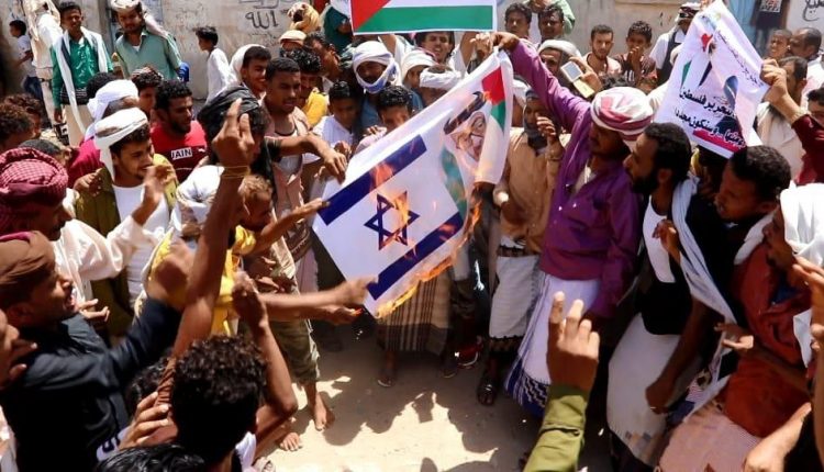 أحرق العشرات من المحتجين في حضرموت, أعلام الاحتلال الاسرائيلي وصور بن زايد تضامنا مع فلسطين.