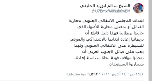 وقال الخليفي : “بريطانيا إعادة أذنابها من الاشتراكي والمؤتمر للسيطرة على “الانتقالي الجنوبي”.
