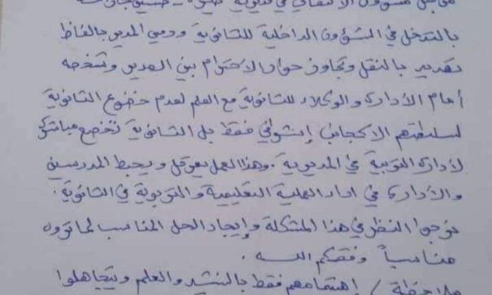 وقال الأستاذ العولقي في محتوى شكواه، أن مشرف الانتقالي أقدم على تهديده بالنقل وتجاوز حدود الاحترام معه أمام الوكلاء والمدرسين داعيا إدارة التربية وضع حلول لهذه التجاوزات التي يستخدمها قيادات الانتقالي.