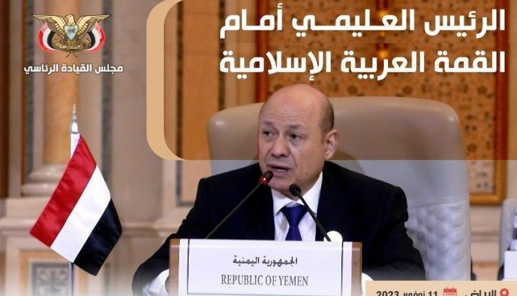 وقال العليمي في الكلمة التي ألقاها خلال القمة العربية الإسلامية التي استضافتها الرياض والتي خرجت ببيان هزيل، قال إنه يرفض أي عمل يهدد مصالح شعوب المنطقة، في رسالة واضحة يغازل فيها العليمي كلاً من الولايات المتحدة وإسرائيل بأنه يرفض أي مساندة عربية للمقاومة الفلسطينية ضد إسرائيل بذريعة أن هذه المشاركة ستتسبب بتهديد شعوب المنطقة.