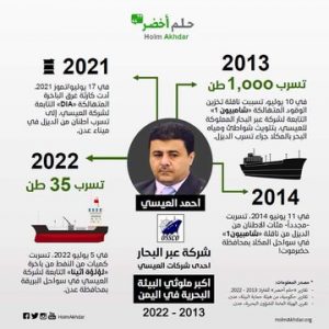 يحذر مراقبون من خطورة التسربات النفطية وتأثيرها البالغ على الحياة البحرية والنظام البيئي البحري في السواحل اليمنية بشكل عام, وسط التجاهل المستمر لحكومة معين والمجلس الرئاسي وسلطات الانتقالي للتداعايات المدمرة لهذه الكارثة.