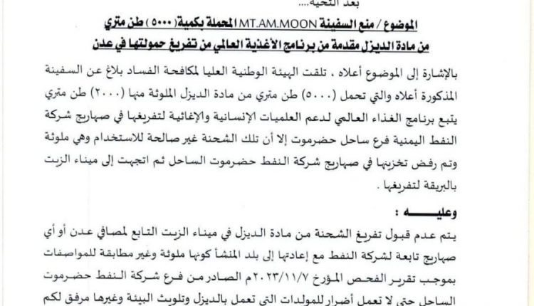 وقالت المصادر إن الشحنة المقدرة ب خمسة آلاف طن متري من الديزل الملوث ، لها اضرار كارثية على المحرمات ورغم علم مصافي عدن بذلك إلا أنها استقبلت السفينة mt . am.moon التي رفض السماح لها بافراغ الشحنة بميناء المكلا بعد أن أكد تقرير الفحص الخاص بالشحنة الأسبوع الماضي إنها ملوثة وغير صالحة للاستخدام وتسبب اضرار للمولدات التى تعمل بالديزل وكذا ملوثة للبيئة ، وفيما طالب التقرير بإعادة الشحنة إلى بلد المصدر ، و تم رفض افراغ شحنتها في حضرموت ، اتجهت السفينة إلى ميناء الزيت بالبريقة بمدينة عدن و افرغت شحنتها من الديزل الملوث في مصافي عدن.