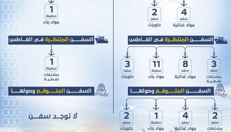 واوضحت الإحصائية أن ميناء الحديدة يتوقع وصول تسع سفن أخرى خلال الايام القادمة، فيما لا يتوقع وصول اي سفينة لميناء عدن.