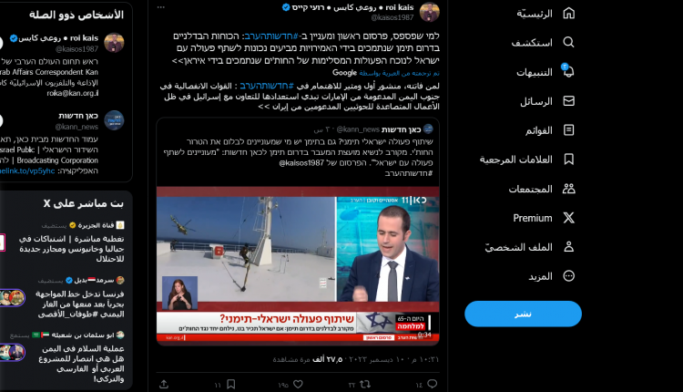 قال صحفي إسرائيلي في هيئة الإذاعة والتلفزيون الإسرائيلية، إن مقرباً من رئيس المجلس الانتقالي الجنوبي أبلغ الإسرائيليين استعداد الانتقالي أن يكون يد إسرائيل لضرب الحوثيين ومنع تهديداتهم ضد سفن الاحتلال.