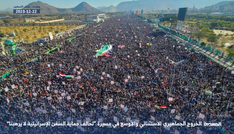 حذر بيان مسيرات صنعاء الحاشدة تحت شعار “تحالف حماية السفن الإسرائيلية لا يرهبنا”: من اي اعتداء على اليمن لن يمر دون رد وقد أعذر من أنذر.