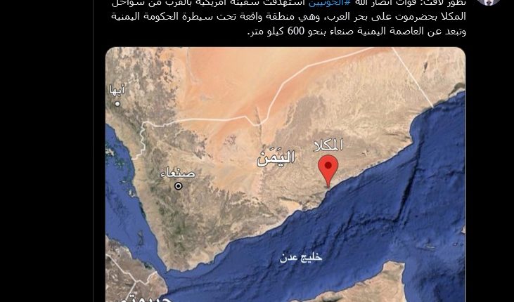 وقال النمري في حسابه على موقع إكس “تطور لافت: قوات أنصار الله الحوثيين استهدفت سفينة أمريكية بالقرب من سواحل المكلا بحضرموت على بحر العرب، وهي منطقة واقعة تحت سيطرة الحكومة اليمنية وتبعد عن العاصمة اليمنية صنعاء بنحو 600 كيلو متر”.