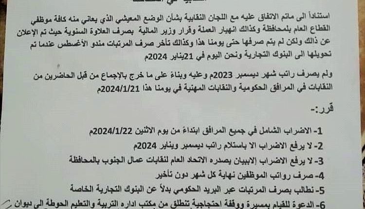 وطالب بيان الاتحاد واللجان النقابية بصرف مرتبات الموظفين عبر البريد اليمني الحكومي بدلا من الشركات التجارية الخاصة، وأعلنوا تشكيل مجلس تنسيق موحد يضم النقابات التربوية بالمحافظة.