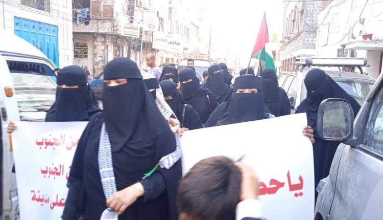 نظم قطاع المرأة بمجلس الحراك الثوري الجنوبي بعدن اليوم تظاهرة حاشدة تنديداً بتدهور الأوضاع المعيشية وانهيار العملة المحلية وتضامناً مع الشعب الفلسطيني في غزة.