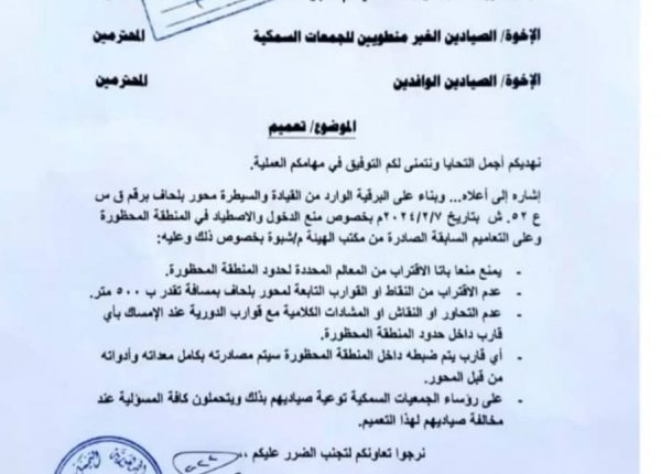وشددت الوثيقة على عدم التحاور والنقاش أو الدخول بمشادات كلامية مع قوارب الدوريات عند الإمساك بأي قارب للصيادين داخل “المنطقة المحظورة”.