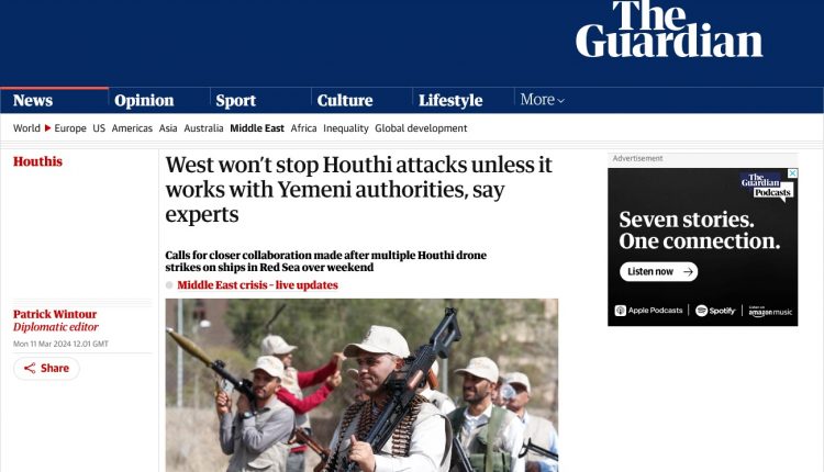 قالت صحيفة الجرديان البريطانية أن السياسيين والخبراء يحذرون من أن الجهود الغربية لوقف هجمات الحوثيين على السفن الإسرائيلية وسفن الدول الحامية لإسرائيل كأمريكا وبريطانيا في البحر الأحمر ستفشل ما لم تقم الولايات المتحدة وحلفاؤها ببناء علاقات استخباراتية وعسكرية أقوى مع الحكومة المعترف بها من قبل الأمم المتحدة في اليمن لقتال الحوثيين ومنعهم من مواصلة الهجوم ضد إسرائيل وحلفائها.