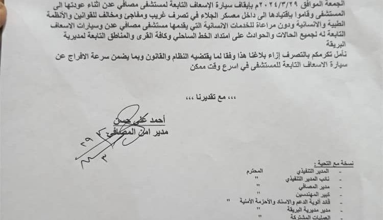 وأوضحت المذكرة، أن هذا التصرف أدى إلى تعطل وتوقف الخدمات التي تقدمها المستشفى وسيارات الإسعاف التابعة لها لجميع الحالات والحوادث على امتداد الخط الساحلي، وكافة القرى والمناطق التابعة لمديرية البريقة.