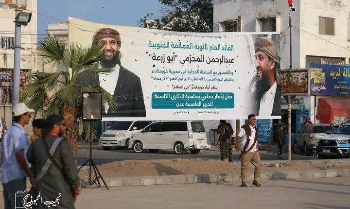 ودفع أبو زرعة المحرمي نائب عيدروس الزبيدي والعضو مع الزبيدي أيضاً في المجلس القيادي الرئاسي، دفع بأنصاره للتظاهر في ساحة العروض بذكرى معركة عدن.