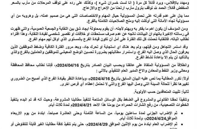 وأصدرت نقابة شركة النفط فرع شبوة بيانا أعلنت فيه التصعيد بالاضراب الجزئي ابتداءً من يوم الأربعاء القادم 24 أبريل 2024م برفع الشارات الحمراء لمدة 3 أيام ، تليها خطوات إضراب شامل وعام يوم 29/ابريل القادم، حتى يتم تنفيذ كافة مطالبهم من غير نقاش أو تفاوض.