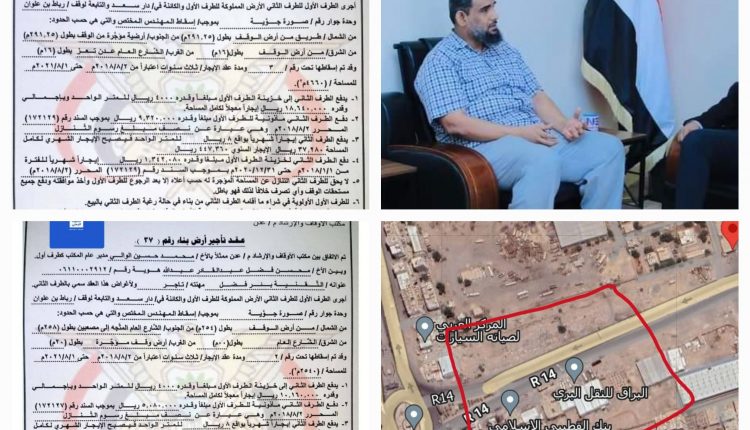 وكشفت المصادر ، عن تصرف مدير مكتب الأوقاف بعدن محمد حسين الوالي، بأراضٍ يتجاوز إجمالي مساحتها 7 آلاف متر مربع، لصالح أحد التجار المقربين منه، وبالمخالفة للقانون.