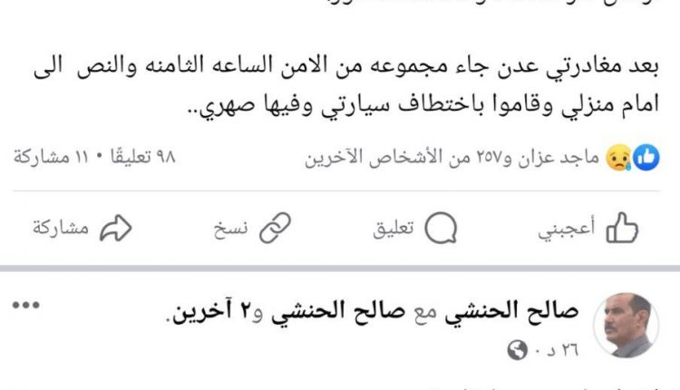 وقال الكاتب صالح الحنشي، في منشور على حسابه بموقع فيس بوك،”اضطرينا مجبرين لمغادرة عدن، بعد أن قام أفراد أمن باختطاف صهري وسيارتي.
