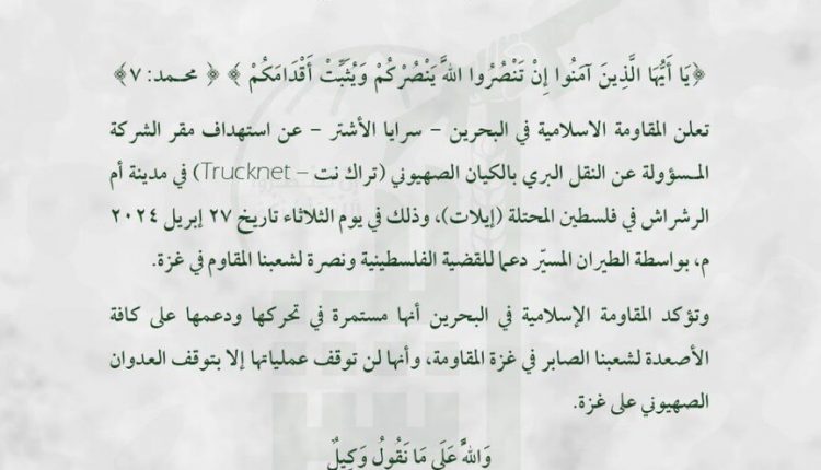 وأوضح بيان صادر عن “سرايا الأشتر” أنه تم استهداف مقر شركة النقل البري الإسرائيلية “تراك نت” (Trucknet) في مدينة إيلات يوم الثلاثاء 27 أبريل، مشيرا إلى أن العملية نفذت “بواسطة الطيران المسير”