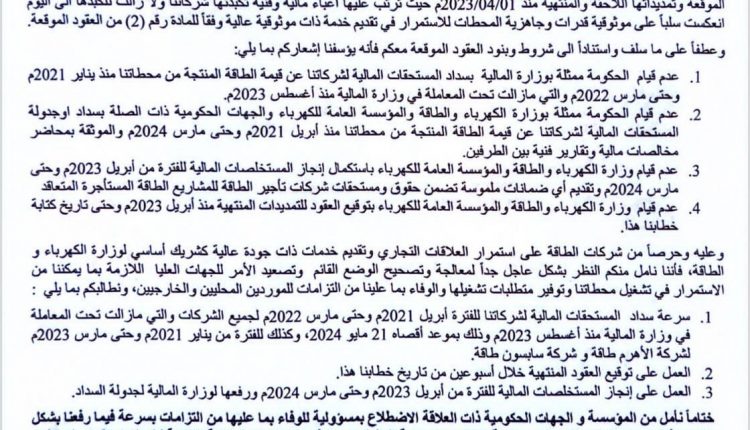 وطالبت مذكرة موجهة من شركات (سابسون أنرجي) و(العليان للطاقة) و (الأهرام للطاقة) و(مجموعة السعدي) موجهة إلى وزير الكهرباء والطاقة مانع يسلم بن يمين، بـ”سرعة سداد المستحقات المالية لشركاتنا للفترة أبريل 2021م وحتى مارس 2022م لجميع الشركات والتي مازالت تحت المعاملة في وزارة المالية منذ أغسطس 2023م وذلك بموعد أقصاه 21 مايو 2024، للسداد وكذلك للفترة من يناير 2021م وحتى مارس 2023م