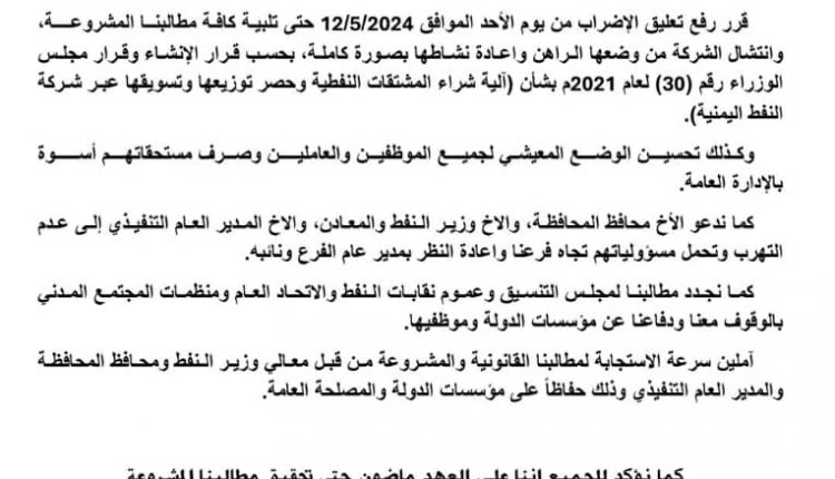 نقابة عُمال شركة النفطـ بشبوة تعلن استئناف الإضراب